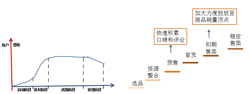 爆款分为4个阶段:启动阶段、成长阶段、成熟阶段、衰落阶段,不同的阶段针对性的做不同的工作。启动阶段包含:选品、资源整合、测款;成长阶段包含:预售、首发;成熟阶段包含初期售卖;衰落阶段包含:稳定售卖。