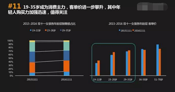 女装自然女性买的多。2015年到2016年,女生的占比越来越高;第二步看一下年龄层级,女装购买的客单价会随着年龄上升而上升,客单越高的客人价值越高。