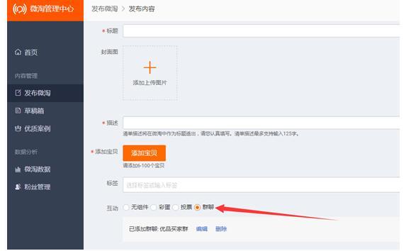2、通过发布微淘-发宝贝清单关联卖家群,并且在微淘动态频道,粉丝可以看见,同时在店铺的“微淘广播”内也能看见,群聊的字体是蓝色的,粉丝只需要点击蓝色字体就能进入群聊!很方便!